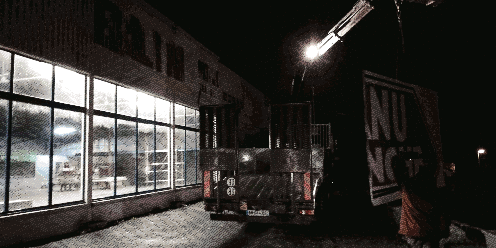 Premier chantier, le démontage de l'enseigne, qui avec le temps menacait de tomber en cas de gros coup de vent. Merci à Alexis Chaperon de son aide précieuse et de sa patience dans le vent et sous la pluie... Après un déssoudage en règle, nous avons pu déposer délicatement l'enseigne historique "Manu Manche", pour laisser place à la page blanche à écrire (et un peu à des traces du passé du bâtiment, aussi!).